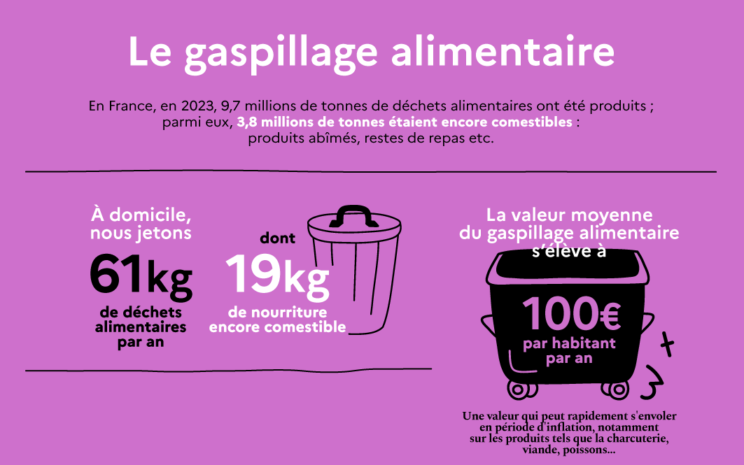 En France, en 2023, 9,7 millions de tonnes de déchets alimentaires ont été produits ; parmi eux, 3,8 millions de tonnes étaient encore comestibles : produits abîmés, restes de repas, etc.